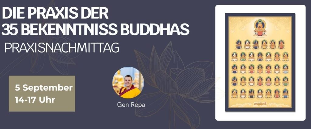 15:45-17 Uhr Praxis der 35 Bekentnissbuddhas „Bekenntnis moralischer Übertretungen des Bodhisattvas„, eine der kraftvollsten buddhistischen Methoden, unseren Geist von aller Negativität zu reinigen.